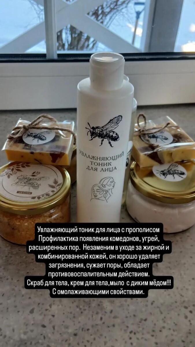 Свеча ЭКО 15р шт, мыло с омолаживающими свойствами 15р, крема по 25р, дикий мёд 290-330гр баночка 30р,леденцы с прополисом 40 копеек 1шт, увлажняющий тоник для лица 20р
