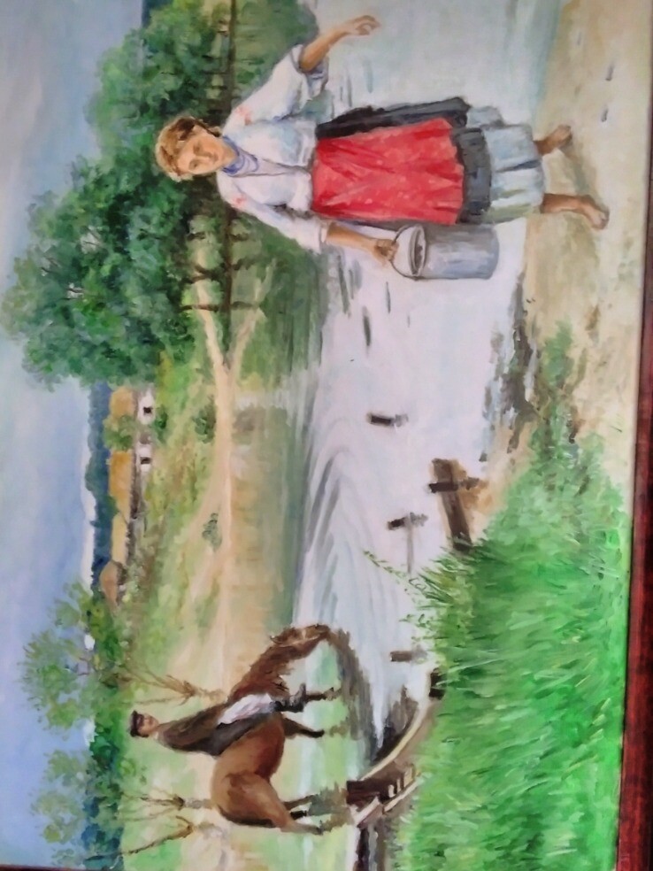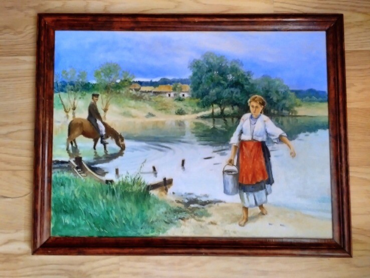 Картина Пимоненко Н.К. "У речки" 1893г.Картина напоминает встречу Г.Мелехова с Аксиньей. Копия. Размеры 52,5 на 39.5см. с рамкой, тонированное дерево, покрытое лаком. ДВП (тонкое) . Масло. Картина смотрится лучше, чем на фото.