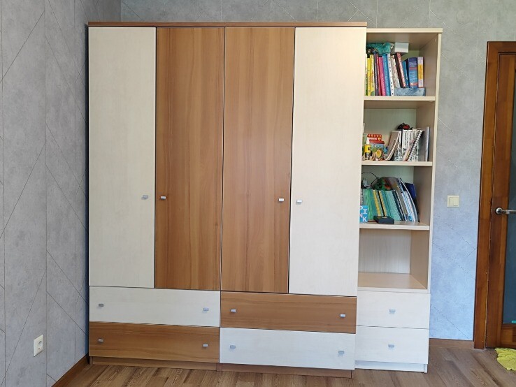 Можно переставить двери и выдвижные полки и получатся шкафы с однотонным полотном.