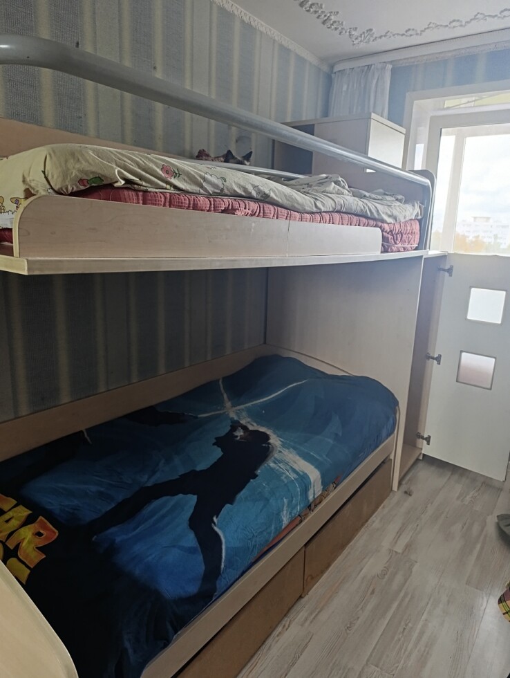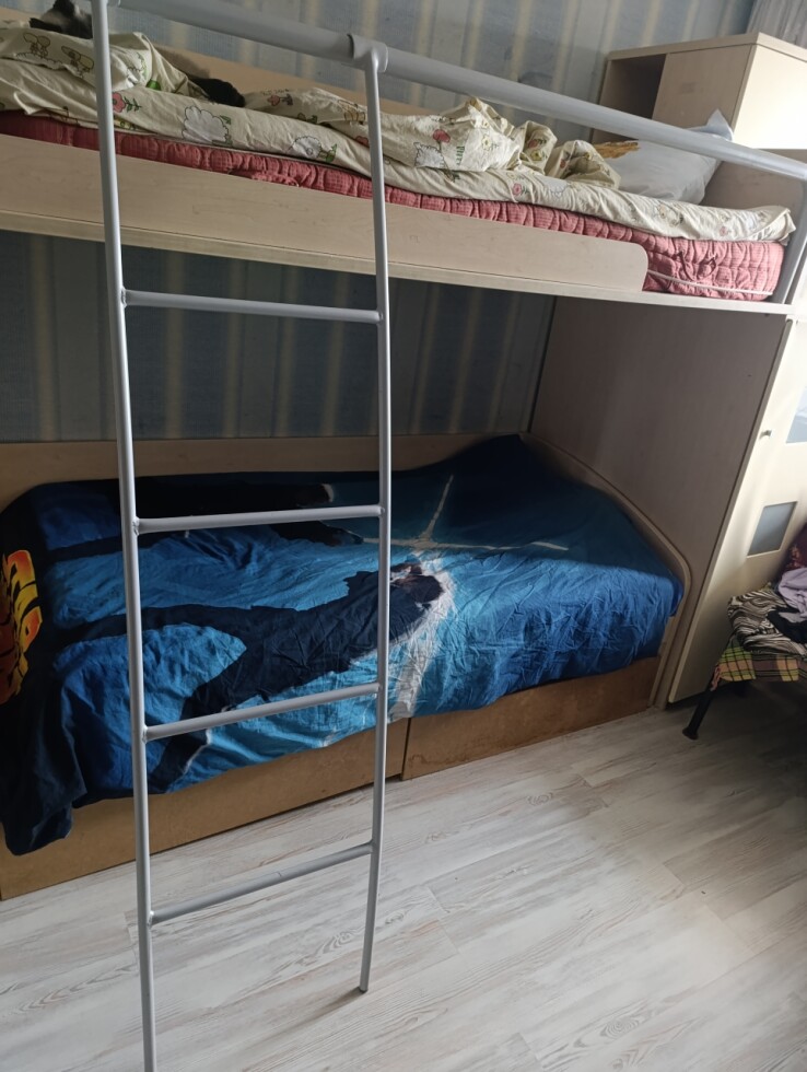 Продаётся 2 ярусная кровать 90х200 с ящиками для белья, матрасами, шкаф для одежды,на 2 ярусе тайник,прочная лестница железная,комод 80 х 60 Ящики и комод нужно подделать . Можно на дачу,маме и ребенку,для квартирантов