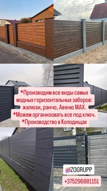 Производство находится в Колодищах, шоурум Тимирязева 114 . Для ознакомления с примерами наших работ посетите нашу фотогалерею по ссылке https://заборавеню.бел/ Также следите за нами в Instagram @IZOGRUPP, чтобы быть в курсе всех новинок и акций.