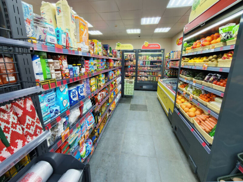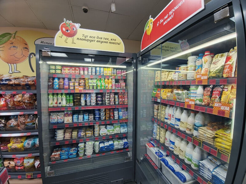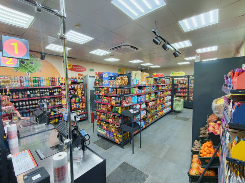 В магазине предусмотрено две обычные кассы (без касс самообслуживания). При небольшой площади магазина, в продаже неплохой выбор овощей и фруктов. Имеется охлажденная курица и колбаски в упаковке. Молочные продукты. Колбасы, салаты, намазки.