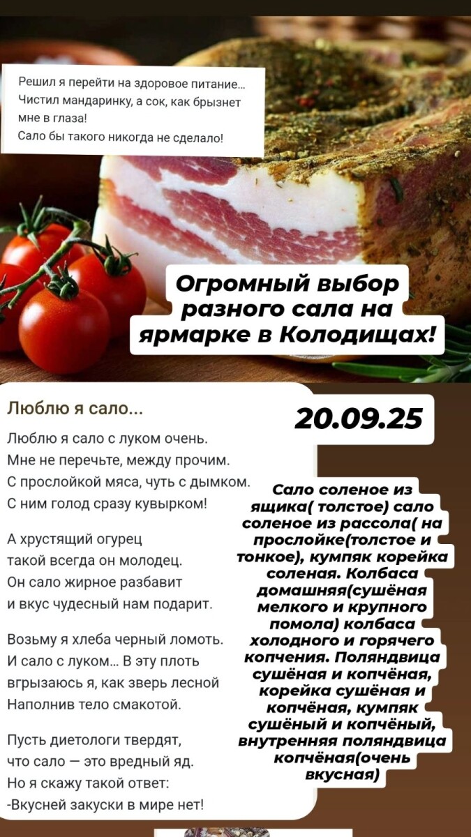 Большой выбор домашнего сала, колбас, мясная продукция.
