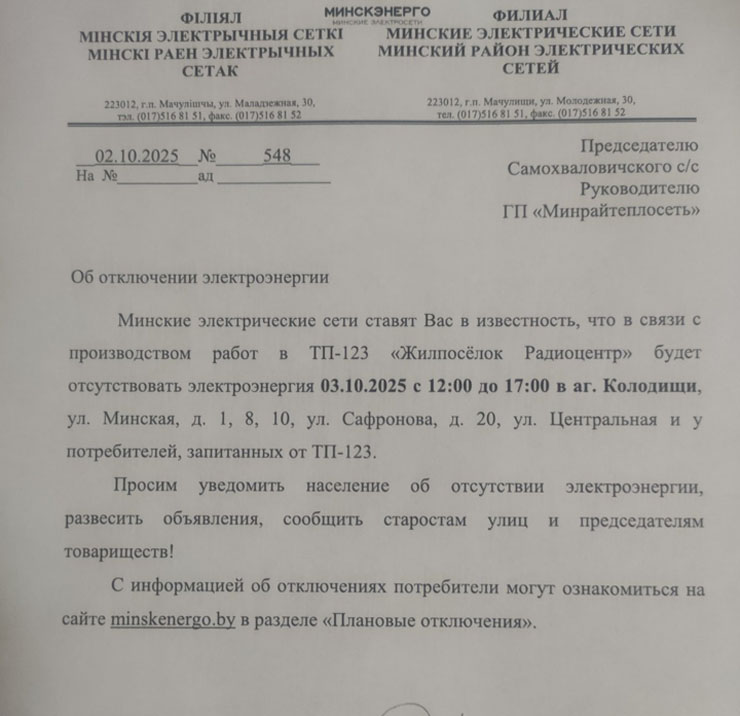 Уведомление об отключении для Колодищи Инфо передали из Колодищанского сельисполкома: