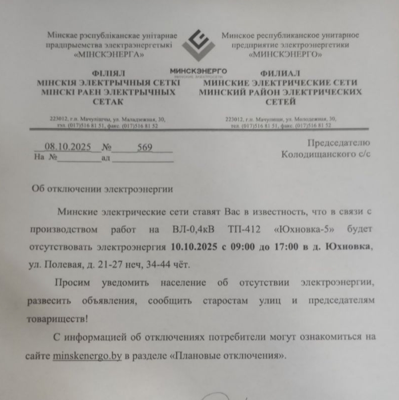 Уведомление об отключении для Колодищи Инфо передали из Колодищанского сельисполкома: