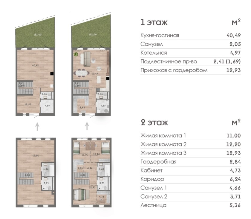 Архитекторы продумали функциональные планировки. На первом этаже предусмотрена светлая кухня-гостиная с панорамным витражным остеклением и выходом на участок. У входа в квартиру разместятся гардеробная, санузел и мини-котельная. На втором этаже – мастер-спальня с собственным помещением для личного гардероба и санузлом. Места хватит на еще две спальни и ванную комнату.