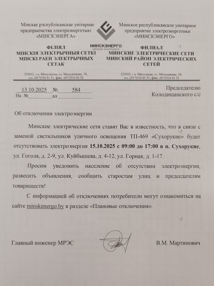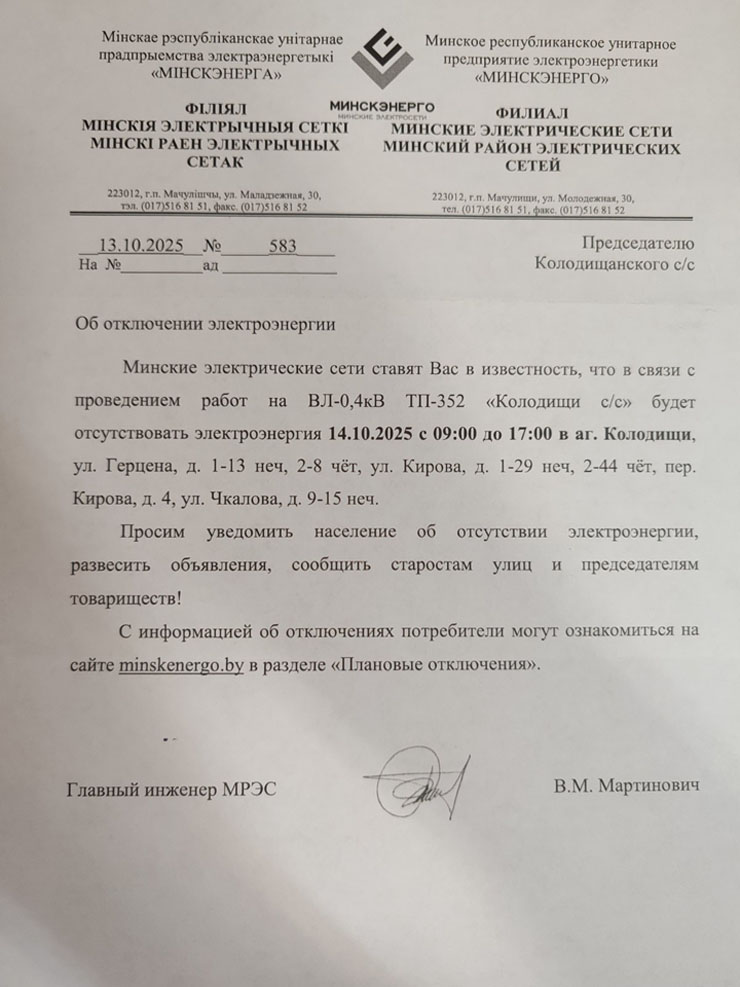 Извещения об отключениях для Колодищи Инфо передали из Колодищанского сельисполкома: