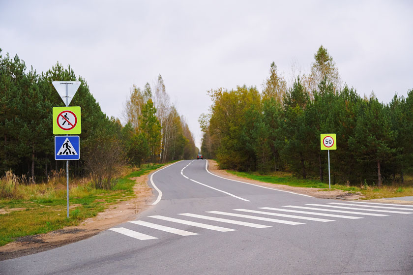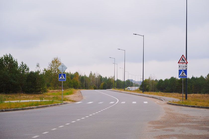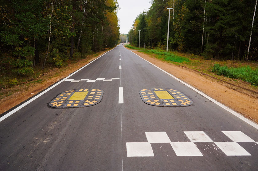 Проезжая часть включает по одной полосе в каждую сторону. Особенность новой трассы - нестандартные искусственные неровности, так называемые «берлинские подушки безопасности». В отличие от традиционных, они занимают не всю ширину дорожного полотна. Это позволяет мотоциклистам и велосипедистам легко их объезжать, а автобусам - “пропускать” между колес. А для владельцев легковых авто они служат напоминанием о необходимости сбросить скорость. При этом, они меньше воздействуют на подвеску транспорта. Примененные решения по успокоению движения, нехарактерные для Беларуси, повышают безопасность для всех участников движения.