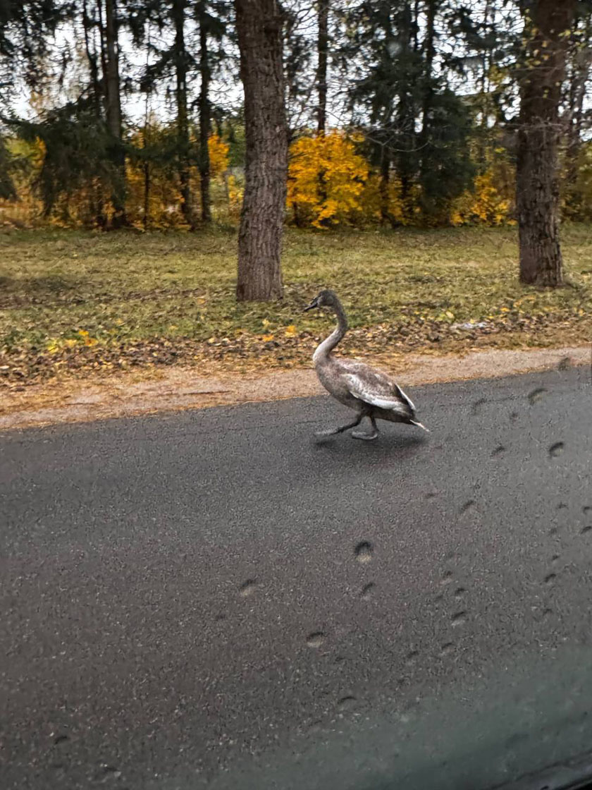 Сегодня утром жительница деревни Юхновка заметила лебедёнка, который бродил по проезжей части в километре от местного озера. Птицу едва не сбивали машины, поэтому местная жительница сумела загнать лебедя к себе во двор и позвонила спасателям.