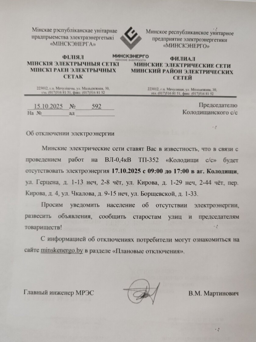 Извещение об отключении для Колодищи Инфо передали из Колодищанского сельисполкома: