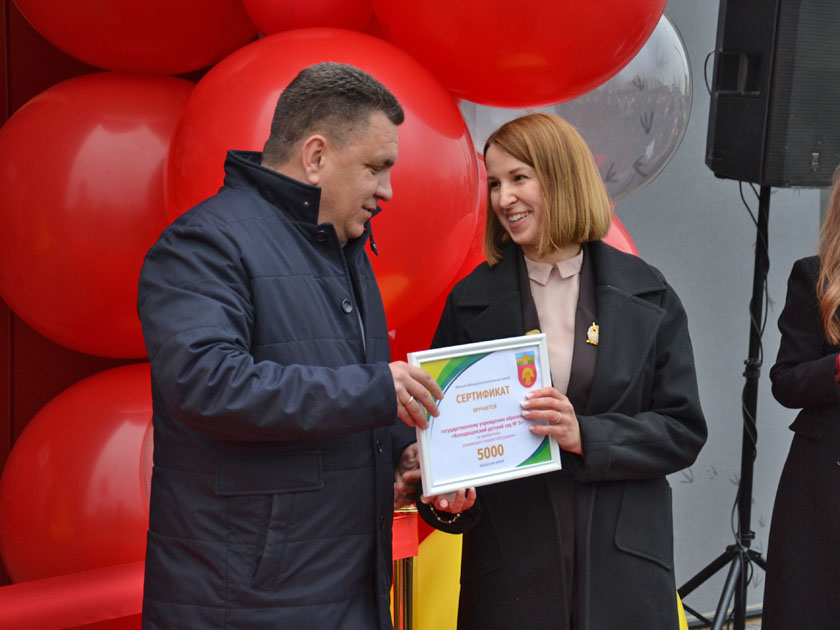 Председатель Минрайисполкома вручает заведующей учреждения образования Садовской Юлии Ивановне сертификат на 5000 рублей для приобретения развивающего игрового оборудования: