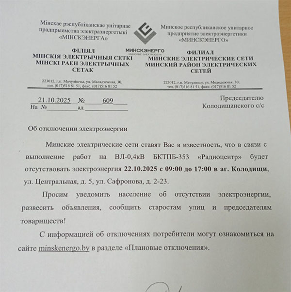 Извещение об отключении для Колодищи Инфо передали из Колодищанского сельисполкома: