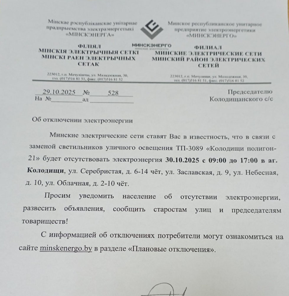 Извещение об отключении для Колодищи Инфо передали из Колодищанского сельисполкома:
