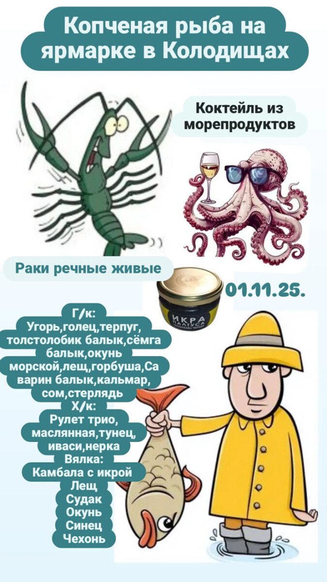 - Копченая рыба и морепродукты, раки речные живые;