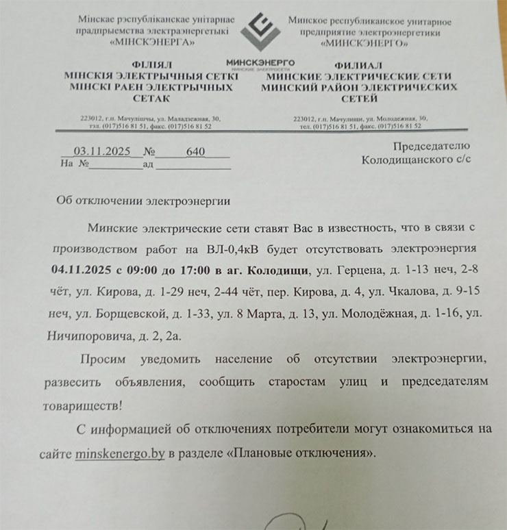 Извещение об отключении для Колодищи Инфо передали из Колодищанского сельисполкома: