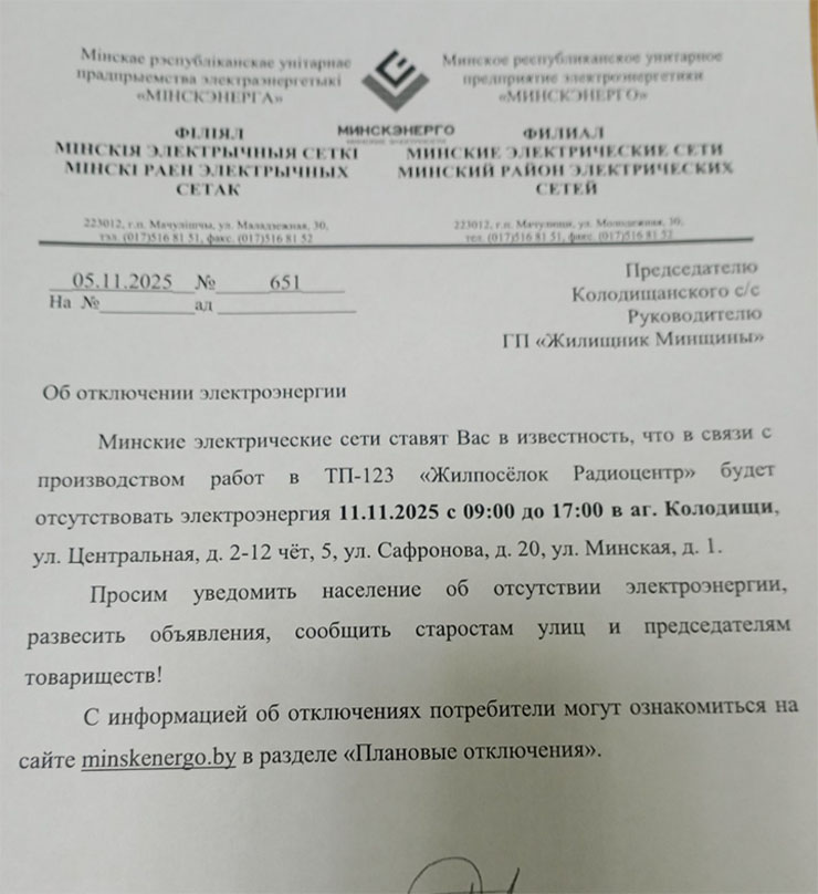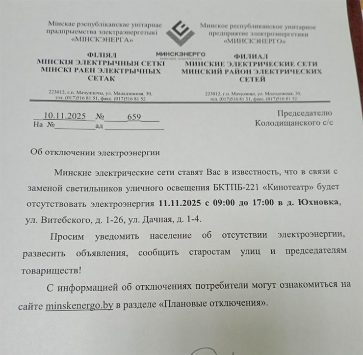 Извещения об отключении для Колодищи Инфо передали из Колодищанского сельисполкома: