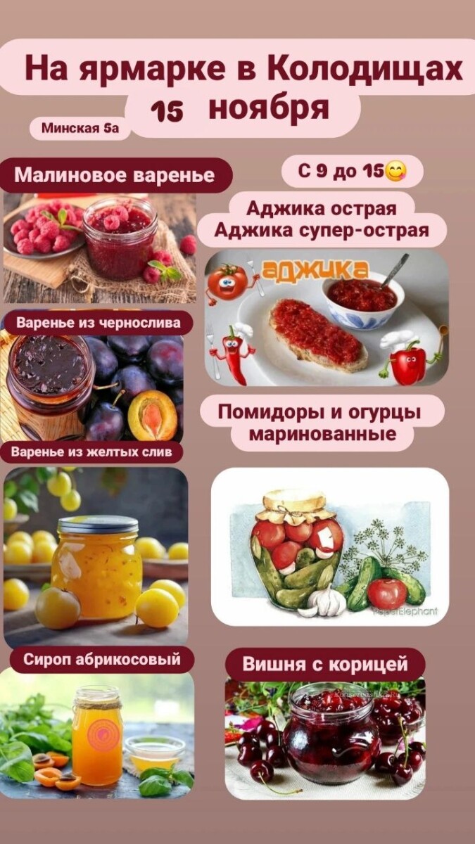 15 ноября в Колодищах по ул. Минская, 5а пройдет ярмарка продукции фермеров и ремесленников. Торговля будет работать, как обычно, с 9.00 до 15.00.