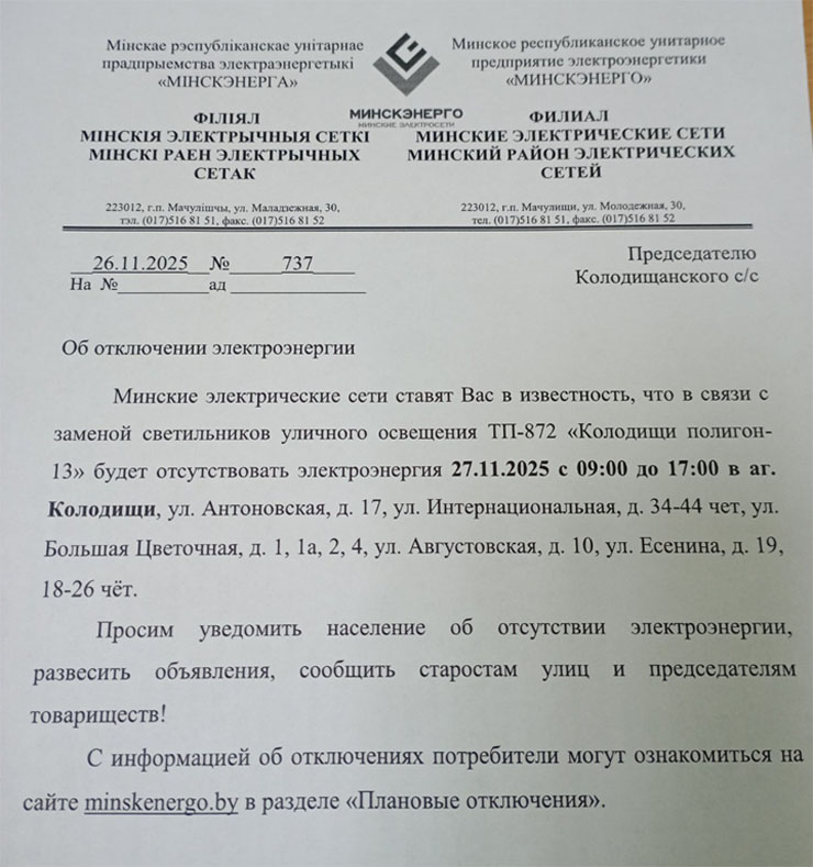 Извещение об отключении для Колодищи Инфо передали из Колодищанского сельисполкома: