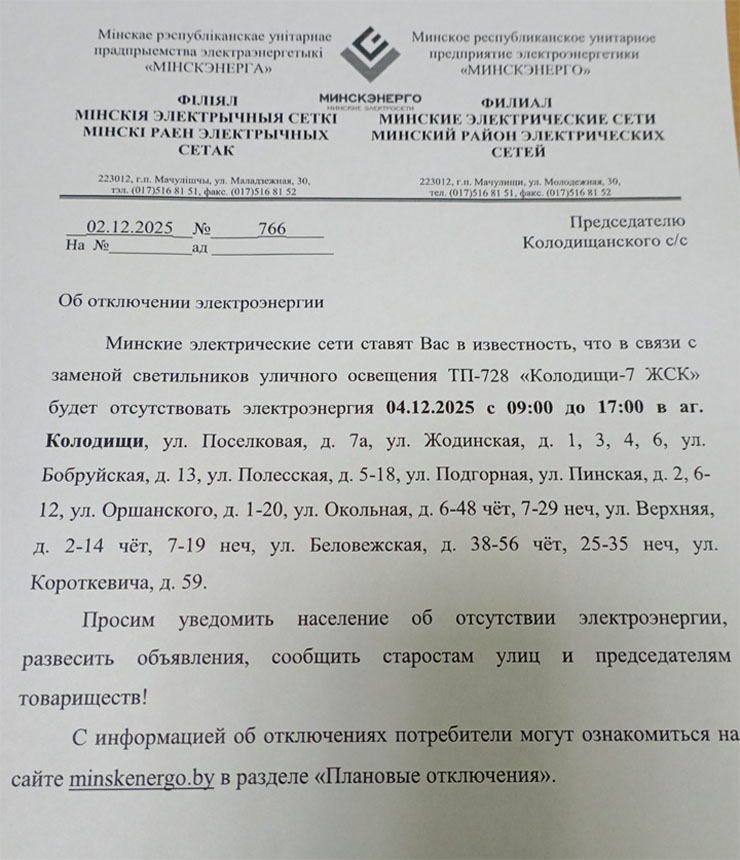 Извещение об отключении для Колодищи Инфо передали из Колодищанского сельисполкома: