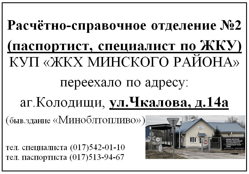 Расчетно-справочное отделение №2 КУП "ЖКХ Минского района" с 5 декабря переехало на новый адрес. Паспортист и специалист по ЖКУ теперь будут работать по адресу: аг. Колодищи, ул. Чкалова, 14а (бывшее здание "Миноблтопливо").