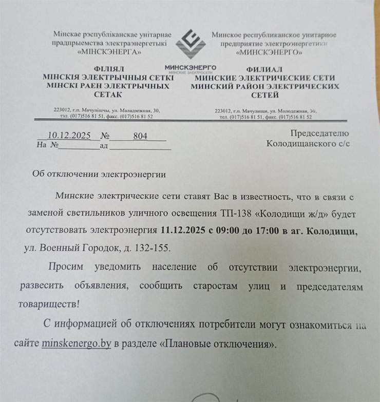 Извещение об отключении для Колодищи Инфо передали из Колодищанского сельисполкома: