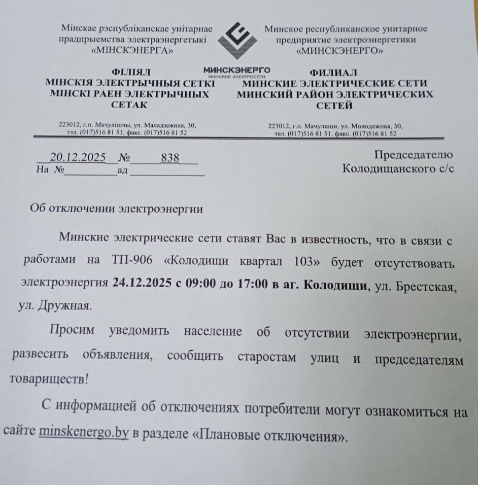 Извещение об отключении для Колодищи Инфо передали из Колодищанского сельисполкома: