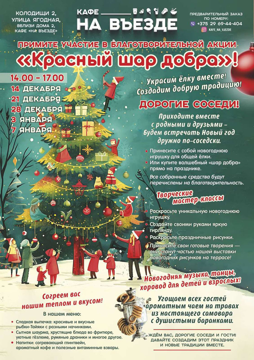 В кафе "На въезде" по воскресеньям проходит благотворительная акция "Красный шар добра". Местные жители вместе украшают общую новогоднюю елку: можно принести с собой новогоднюю игрушку или купить волшебный "шар добра" прямо на празднике. Все собранные средства будут перечислены на благотворительность.