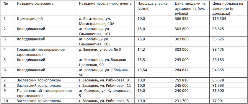 Участок по улице Большая Цветочная в Колодищах (5 место в топ-10) был продан с аукциона в августе. Курс доллара тогда уже упал и при меньшей сумме в рублях, цена в валюте получилась выше, чем у участков на 2 и 3 месте.