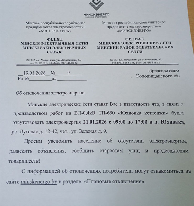 Извещение об отключении для Колодищи Инфо передали из Колодищанского селиьсполкома: