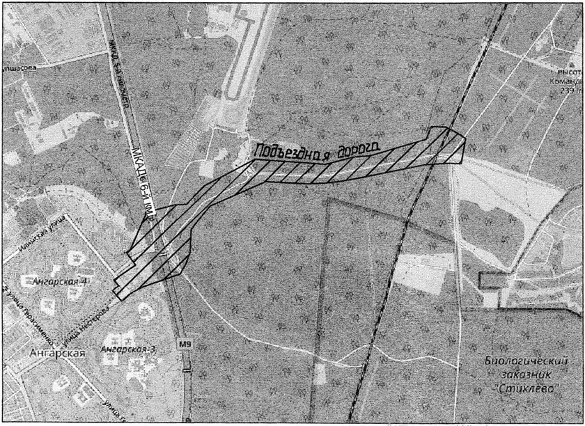В прикрепленных к конкурсу документах можно найти ситуационную схему объекта, по которой видно, что дорога будет строится по пути существующего проезда от МКАД к Зеленой гавани.
