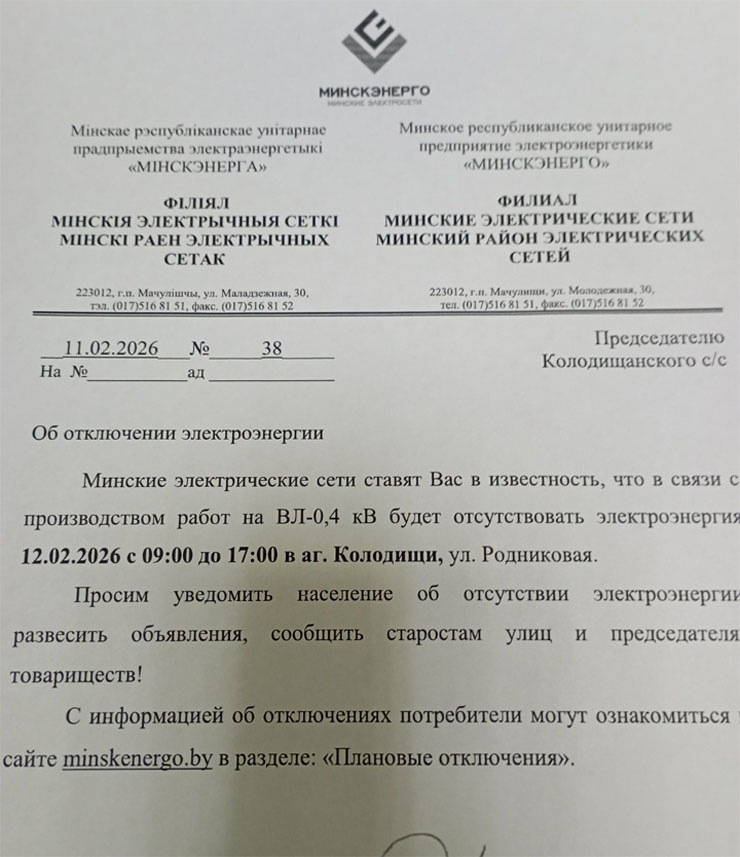 Извещение об отключении для Колодищи Инфо передали из Колодищанского сельисполкома: