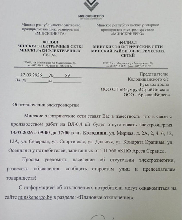 Извещение об отключении для Колодищи Инфо передали из Колодищанского сельисполкома: