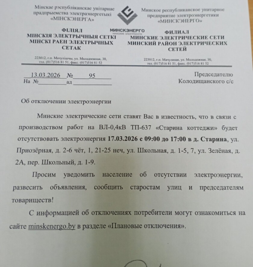 Извещения об отключениях для Колодищи Инфо передали из Колодищанского сельисполкома: