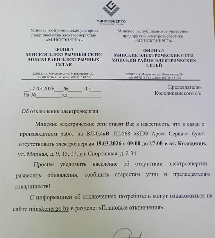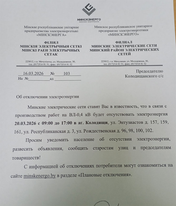 Извещения об отключениях для Колодищи Инфо передали из Колодищанского сельисполкома: