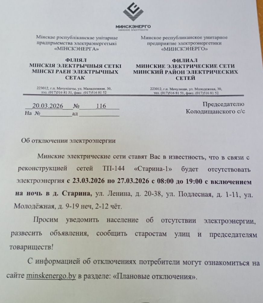 Извещение об отключении для Колодищи Инфо передали из Колодищанского сельисполкома: