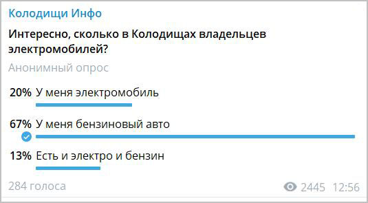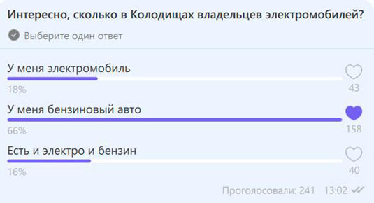Ради интереса, в группах Колодищи Инфо прошел опрос "Сколько в Колодищах владельцев электромобилей?". В опросе приняли участие 525 пользователей. Ответы были следующими: