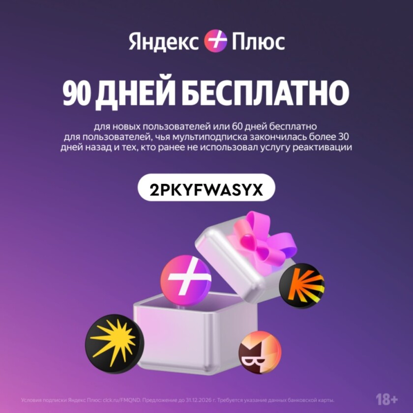 Активируйте промокод 2PKYFWASYX по ссылке https://plus90.prfl.me/sites/akifec — 90 дней доступа к Яндекс Плюс для новых пользователей или 60 дней для пользователей, чья мультиподписка закончилась более 30 дней назад и тех, кто ранее не использовал услугу реактивации