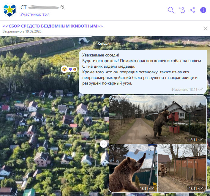 Всё началось с сообщений в общих чатах СТ. Местный житель опубликовал несколько снимков на которых, с выполненной кинематографической четкостью, хоть и не без изъянов, огромный бурый медведь крушил чужие заборы, телефонную будку, противопожарный уголок, газохранилище и даже ломился к председателю СТ.