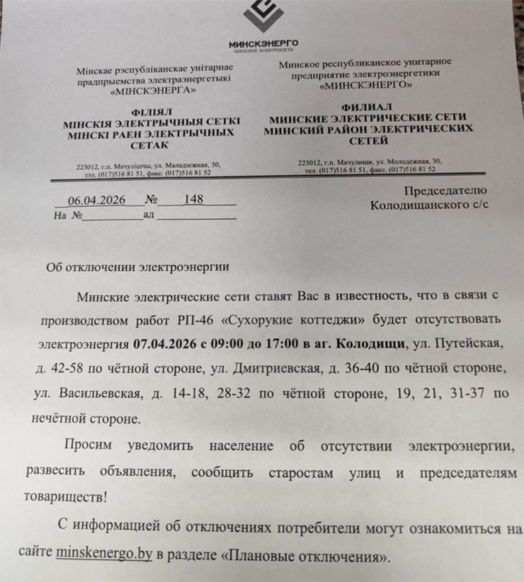 Извещение об отключении для Колодищи Инфо передали из Колодищанского сельисполкома: