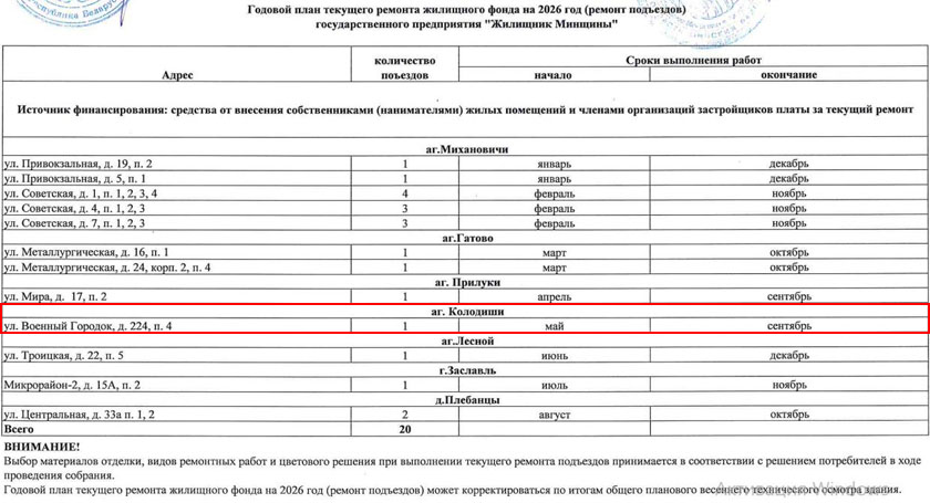 На сайте Минрайисполкома опубликован годовой план текущего ремонта подъездов жилищного фонда на 2026 год. В списке один подъезд в жилом доме 224 по улице Военный городок в Колодищах.
