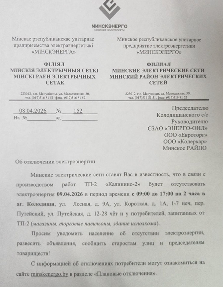 Извещение об отключении для Колодищи Инфо передали из Колодищанского сельисполкома: