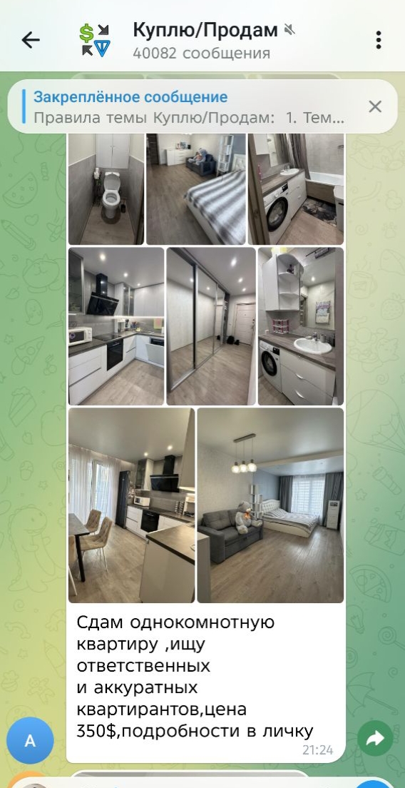 В связи с этим, объявление с нашего чата было удалено. Однако, позже появилось новое - от другого пользователя и с предложением по-реалистичнее: однушка за 350 с хорошим современным ремонтом. Причем фото через поисковики нигде не отбивались.