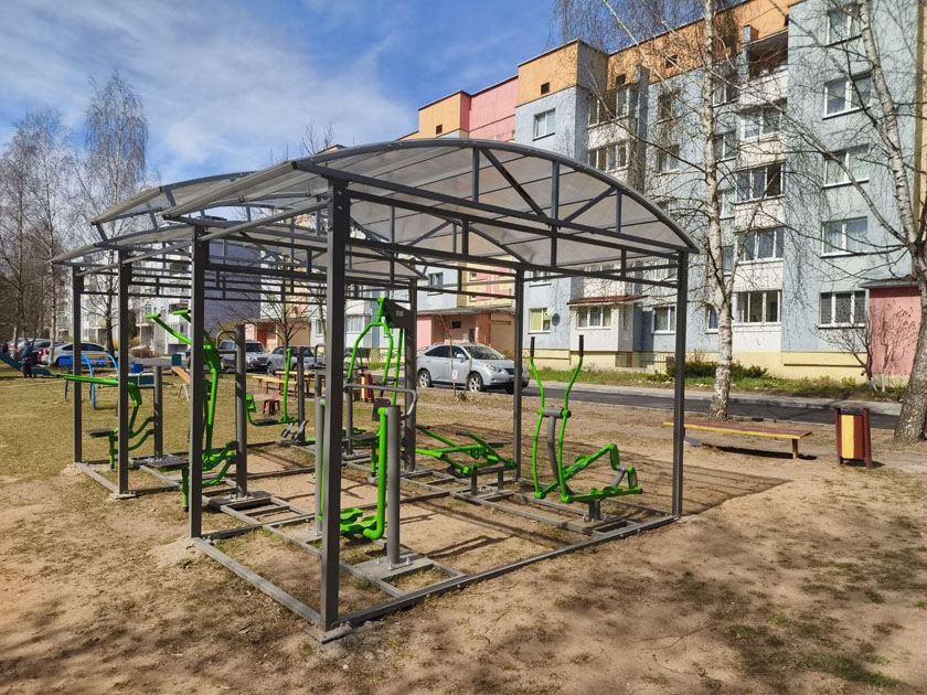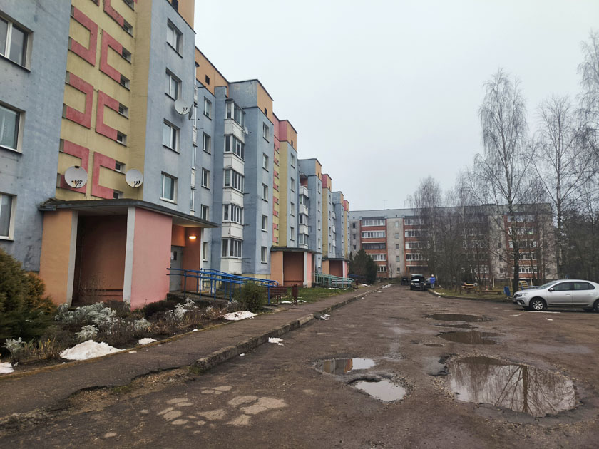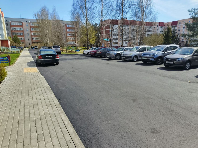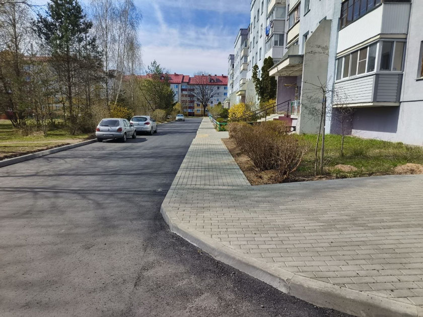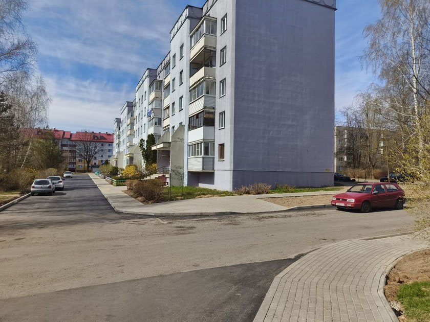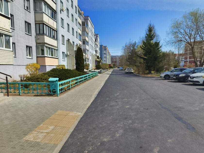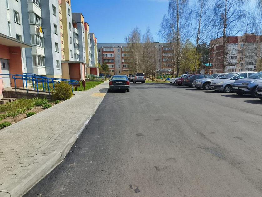 По улице Военный городок в Колодищах провели работы по благоустройству дворовых территорий двух многоквартирных домов. Вдоль домов уложили новый асфальт на проезжей части и парковочных местах, проложили новые тротуары и установили спортивную площадку.