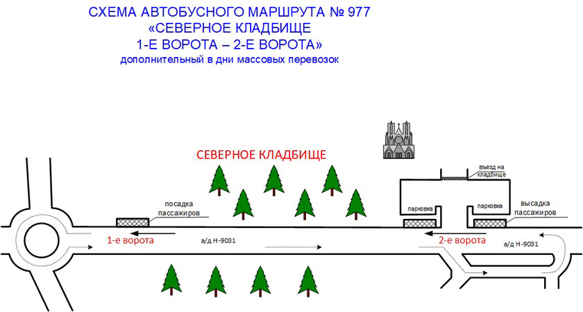 — только 21.04.2026 с 07:00 до 17:00 организуется дополнительный автобусный маршрут № 977 «1-е ворота – 2-е ворота» (Северное кладбище). Остановочные пункты для посадки: «1-е ворота», «2-е ворота».