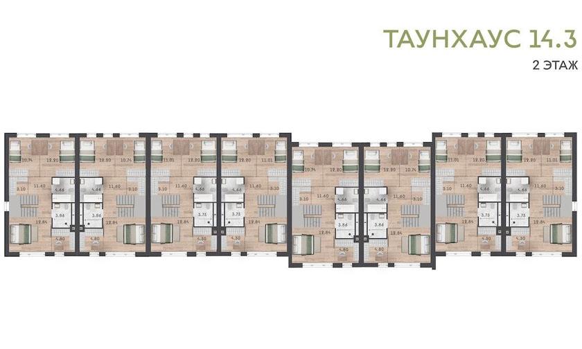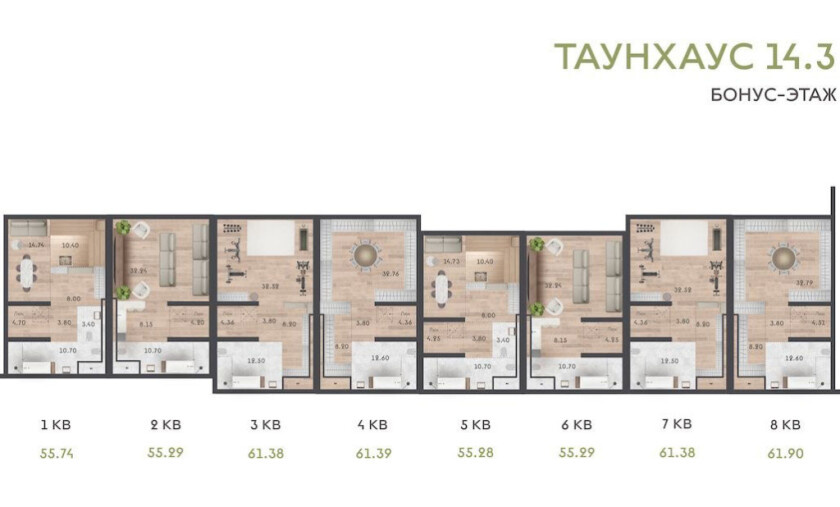 Особенность этого таунхауса — дополнительный этаж на 55-61 «квадрата». Такой будет у каждой квартиры.