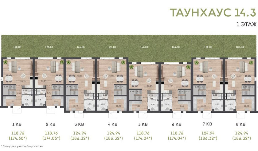 В Зеленой гавани представили оригинальную концепцию таунхауса с двухэтажными квартирами, бонусом к которым идет еще один этаж под землей. Будущие владельцы смогут устроить там библиотеку, домашний кинотеатр, сауну, тренажерный зал, мастерскую или что-то на свой вкус. Причем полезные «квадраты» достанутся им бонусом.