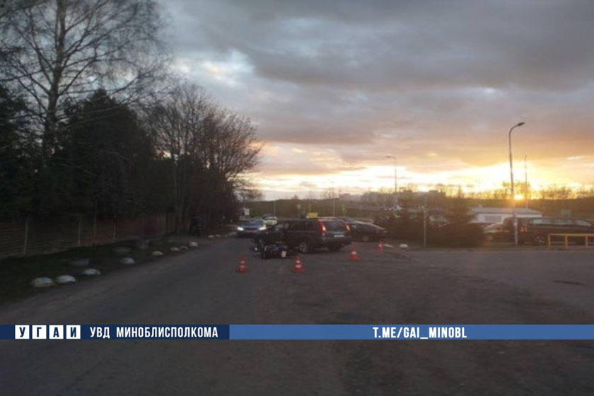 24 апреля примерно в 19:20 в агрогородке Колодищи 53-летний водитель, двигаясь на мотоцикле «MINSK С4 300», при возникновении препятствия в виде выезжающего справа со стоянки магазина «Евроопт» автомобиля «NISSAN X-TRAIL» под управлением 67-летней женщины, не справился с управлением и опрокинулся на проезжей части.