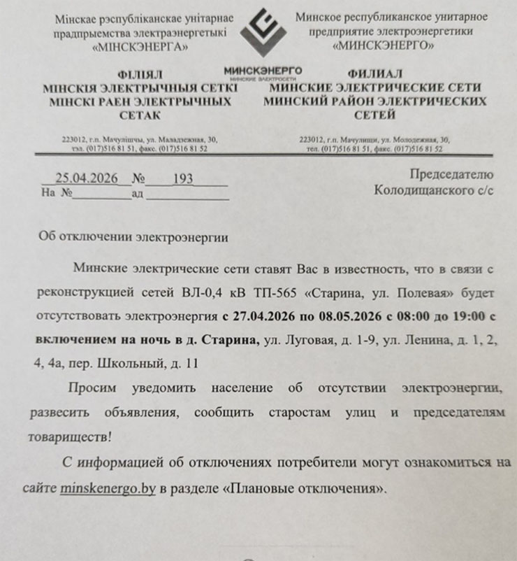 Извещение об отключении для Колодищи Инфо передали из Колодищанского сельисполкома: