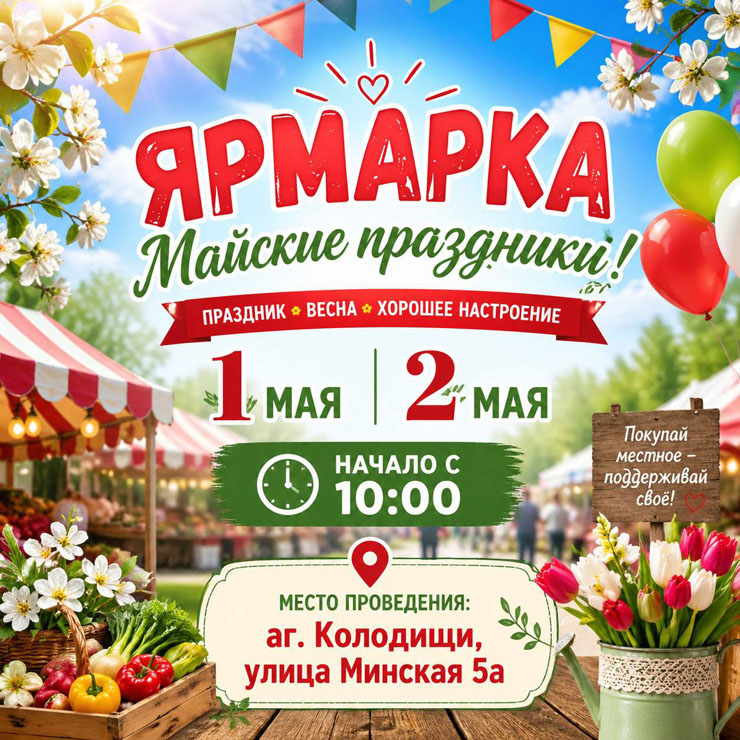 Ярмарка "Тутэйшая гаспадарка" на этой неделе пройдет не только в субботу, но еще и в пятницу: 1 и 2 мая. Афишу мероприятия опубликовали организаторы ярмарки на форуме Колодищи Инфо в Телеграм.